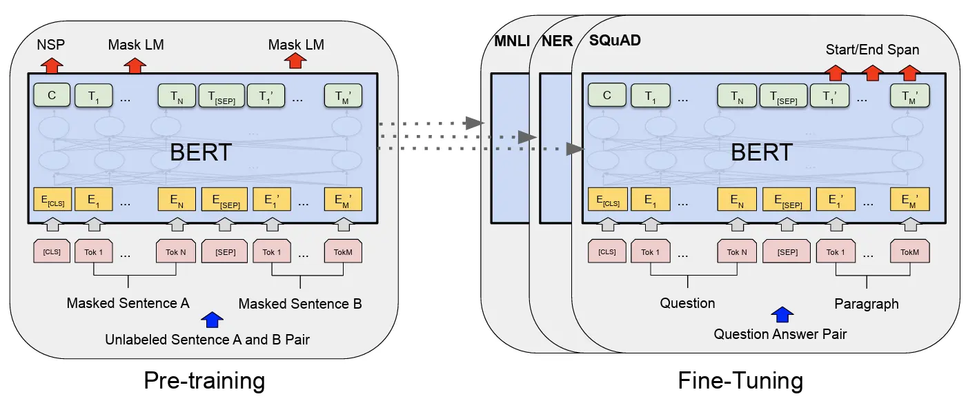 BERT는 지금은 일반적인 Pre-trainig과 Fine-tuning 방식을 적용한 모델입니다. BERT 학습시에는 위키피디아와 같은 방대한 양의 데이터를 이용해 언어의 문법, 문맥, 단어간 관계 등 문맥 파악에 필요한 정보를 대규모로 학습해두고(Pre-training), 세부 테스크를 재학습(Fine-tuning) 해서 성능을 끌어올립니다.