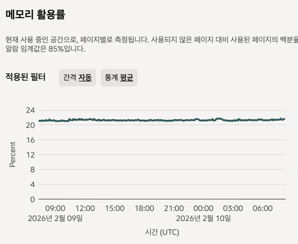 이건 동일한 인스턴스에 PLG 스택을 올린 뒤 캡쳐한 램 사용량입니다. 20%니까 약 2.5기가 정도 소모하고 있는겁니다. ELK에 비해 무려 74%나 감수한 수치입니다. 그래서 인스턴스의 램을 5GB로 줄여서 클라우드 비용 지출까지 줄일 수 있었습니다.