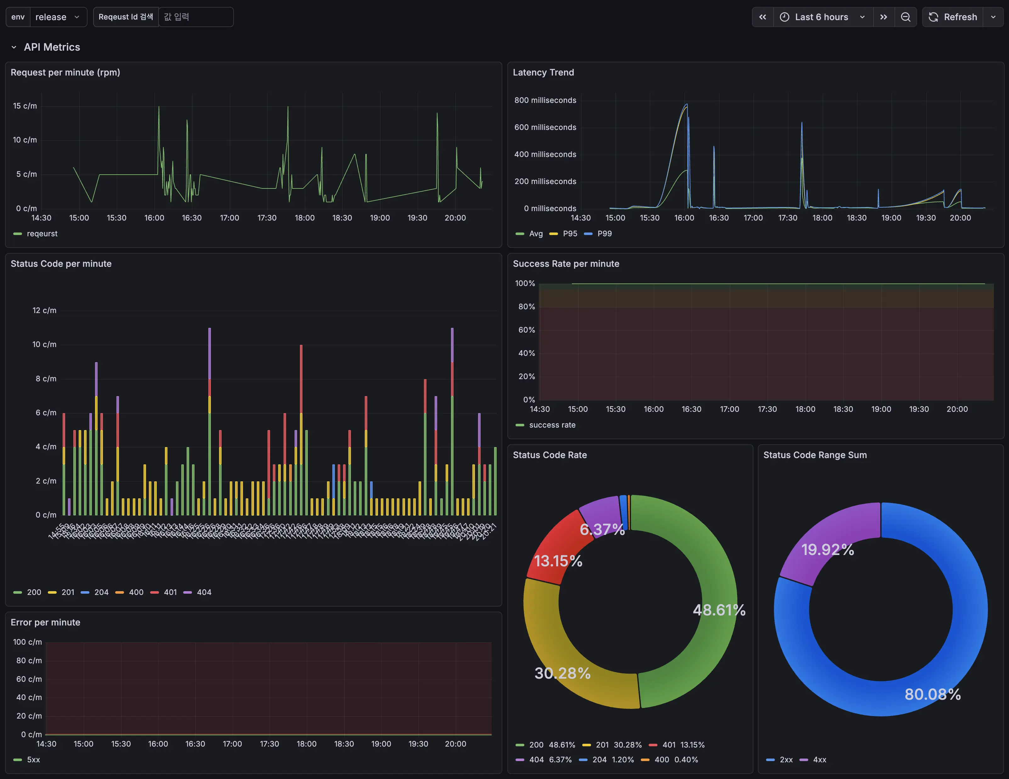 최종적으로 완성된 대시보드 입니다. 분당 요청 횟수, 평균/99%/95% 레이턴시, 분당 응답 코드, 분당 응답 성공/실패율, 응답 코드 비율을 보여줍니다. 아래에는 나오지는 않았지만 로그를 목록으로 보여줍니다.
