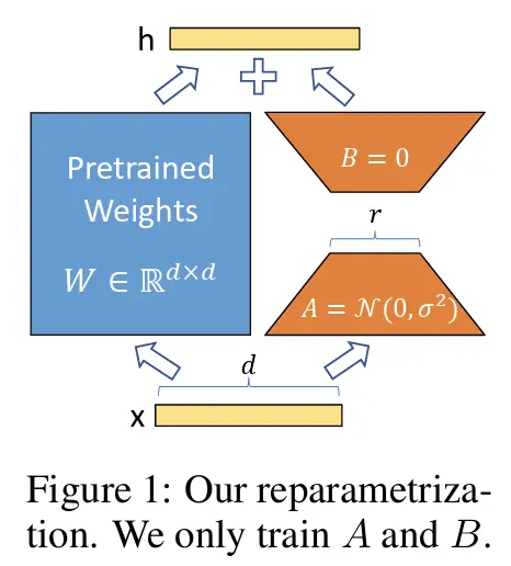 오른쪽에 두 주황색은 weight의 변화량을 행렬 분해한 \(A\)와 \(B\) 행렬로, 각각 LoRA_A, LoRA_B 라고 합니다. 두 행렬 모두 단순한 Linear로 구성되며, LoRA_A는 dxr, LoRA_B는 rxd 크기를 가집니다. 이때 r은 사용자가 설정한 낮은 차원 숫자 입니다.