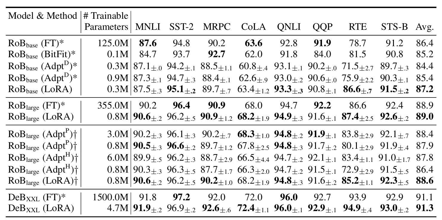 실험 결과를 보면 LoRA는 기존 방식보다 Trainable Parameter의 개수가 약 400배 적지만, 성능은 비슷하거나 더 높습니다. 이는 적은 파라미터로 학습 과정이 안정적으로 진행되었기 때문입니다.