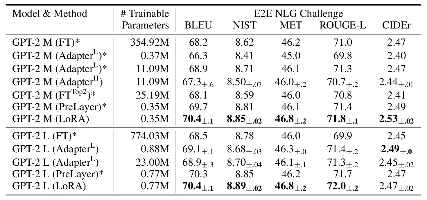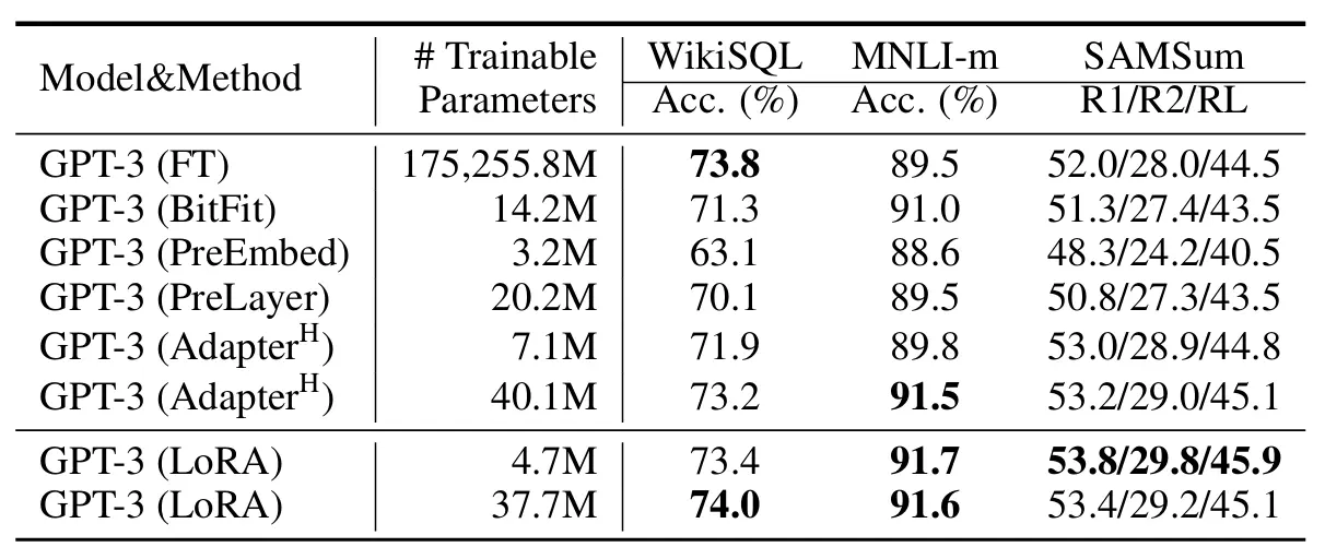 LoRA가 기존 방식보다 Trainable Parameter 개수가 적개는 약 100배, 많게는 약 4700배 차이나지만, 성능은 비슷하거나 오히려 높다는 사실을 알 수 있습니다. 여기서 알 수 있는 점은, LoRA는 모델의 파라미터가 많을수록 효율적이라는 점 입니다.