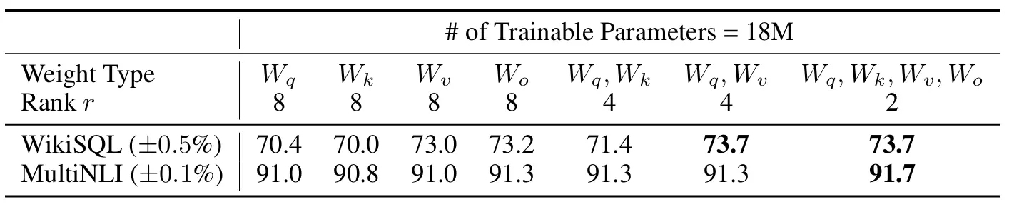 LoRA는 모델의 어느 부분에 적용하는지에 따라 효과가 달라집니다. 논문에서 진행한 몇가지 테스트를 보도록 하겠습니다.