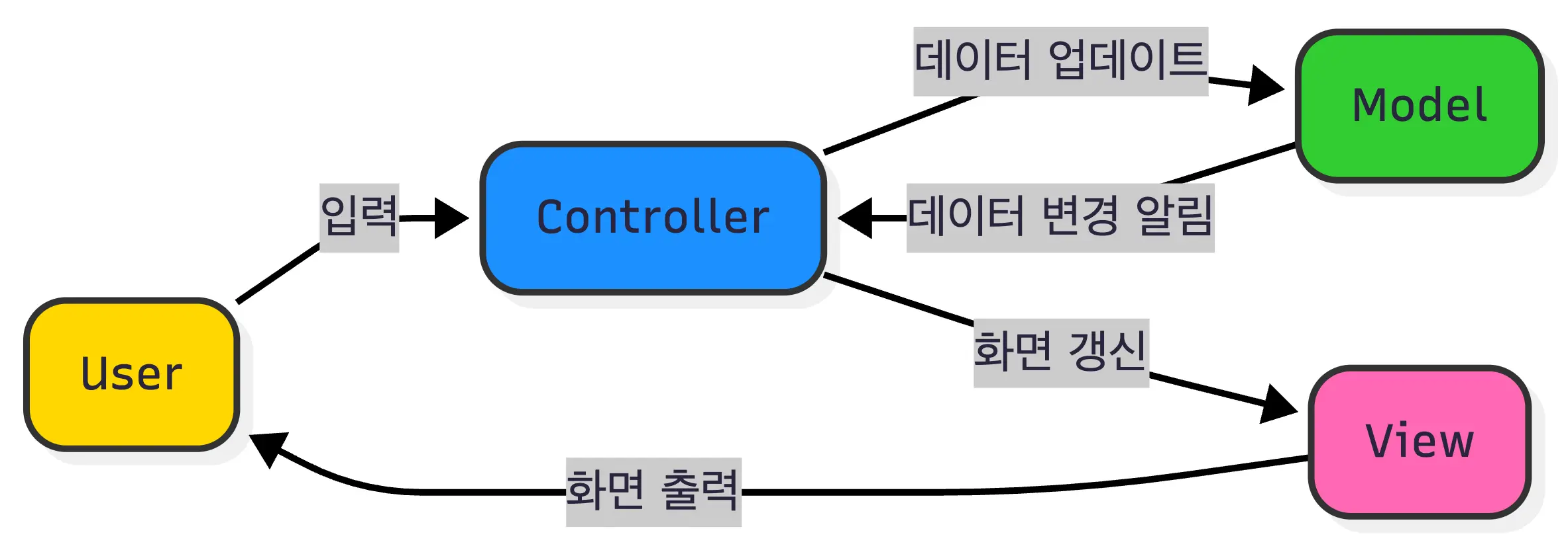 - Controller가 변경된 데이터를 View의 update를 호출합니다.